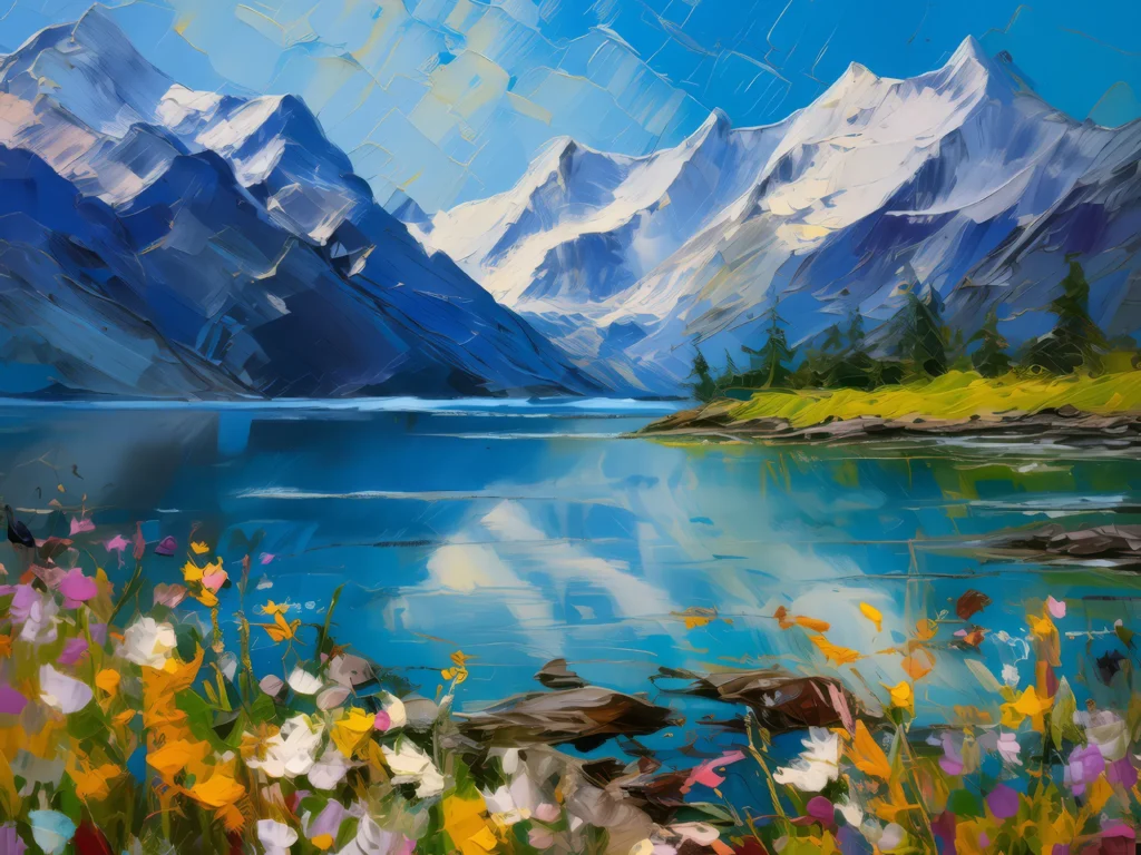 A tranquil glacial lake reflecting towering snow-capped mountains and a clear blue sky, with wildflowers dotting the shoreline.