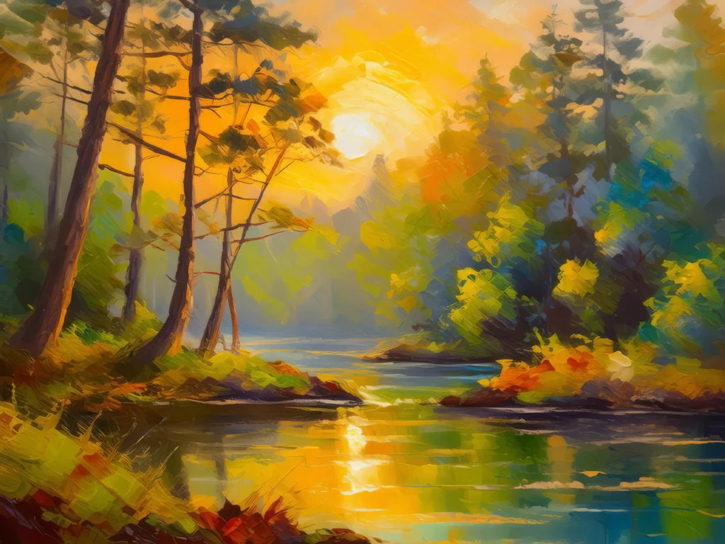 A soft golden light washes over a peaceful temperate forest during the golden hour.