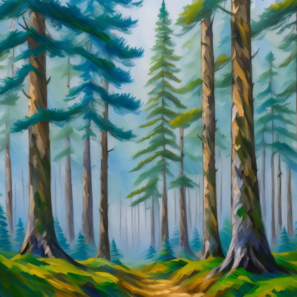 A dense pine forest shrouded in thick fog with towering trees and a mysterious atmosphere.