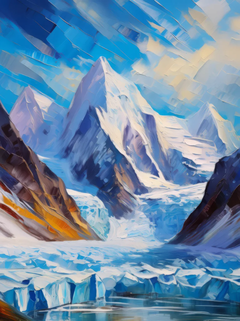 A glacial valley with towering ice formations, snow-covered ground, and a cold, clear sky.