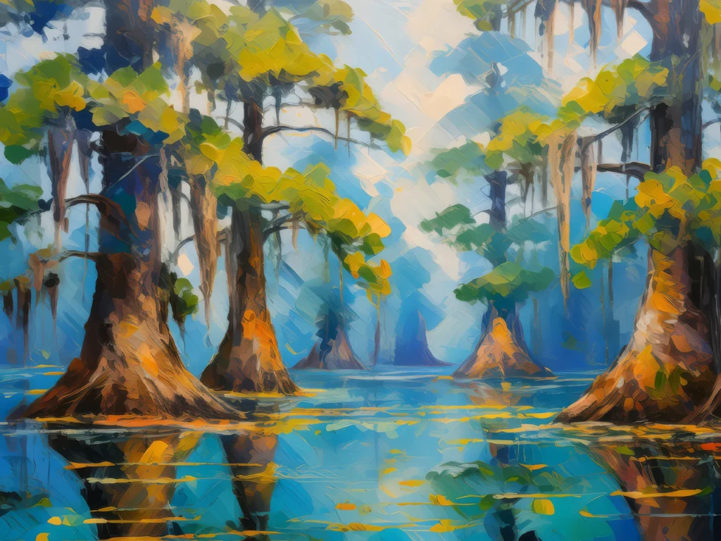 Tall cypress trees rising from the water in a tropical swamp, draped with Spanish moss.