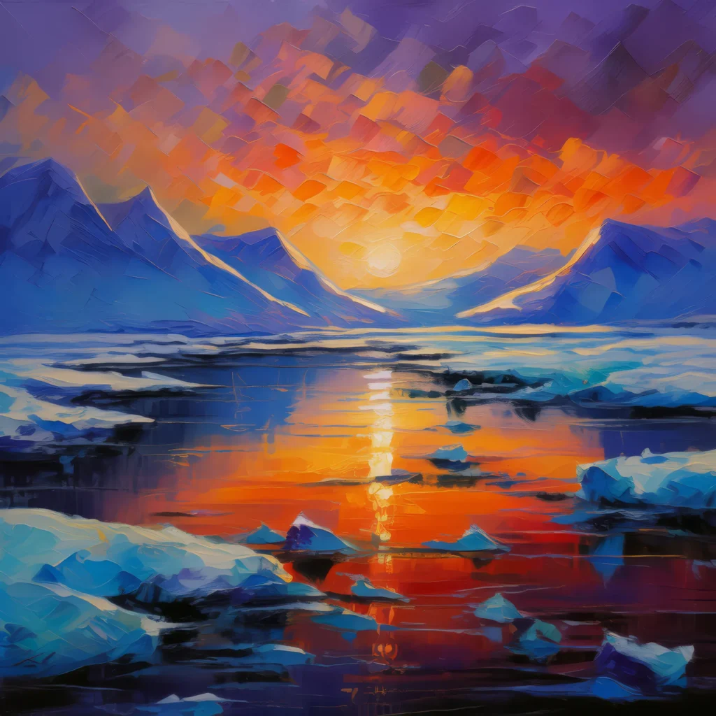 The last gleams of twilight reflect off the icy surfaces of the polar tundra, a fleeting moment of beauty.