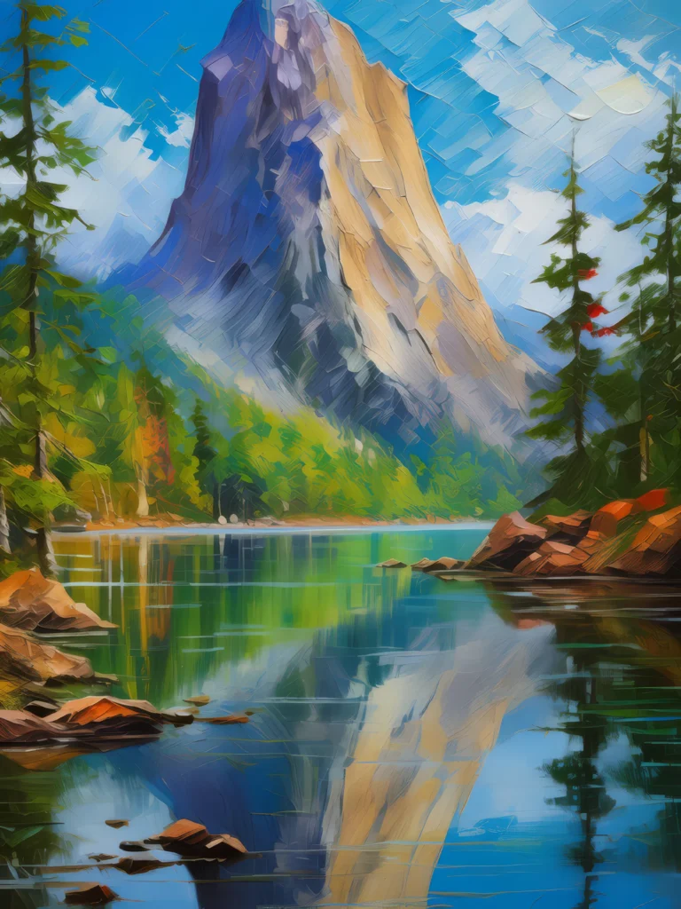 A serene mountain lake perfectly reflects a towering crag, surrounded by a tranquil pine forest.