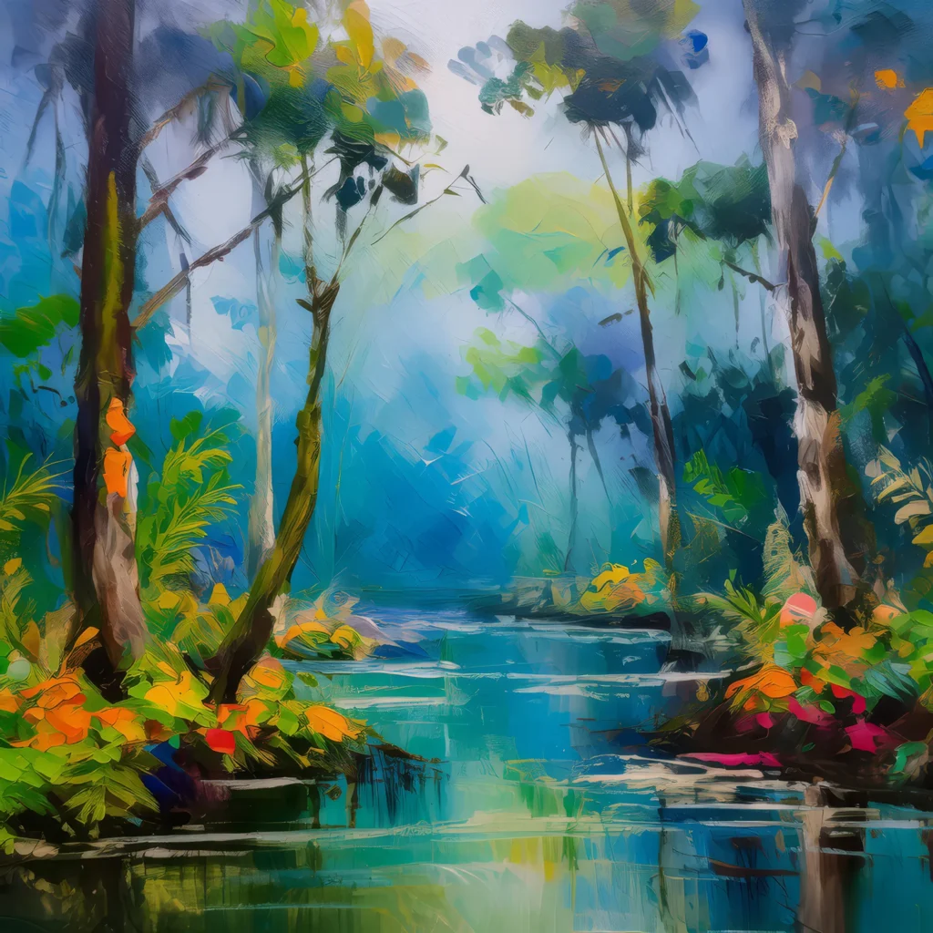 A tranquil tropical swamp with calm waters and dense vegetation under a clear sky.