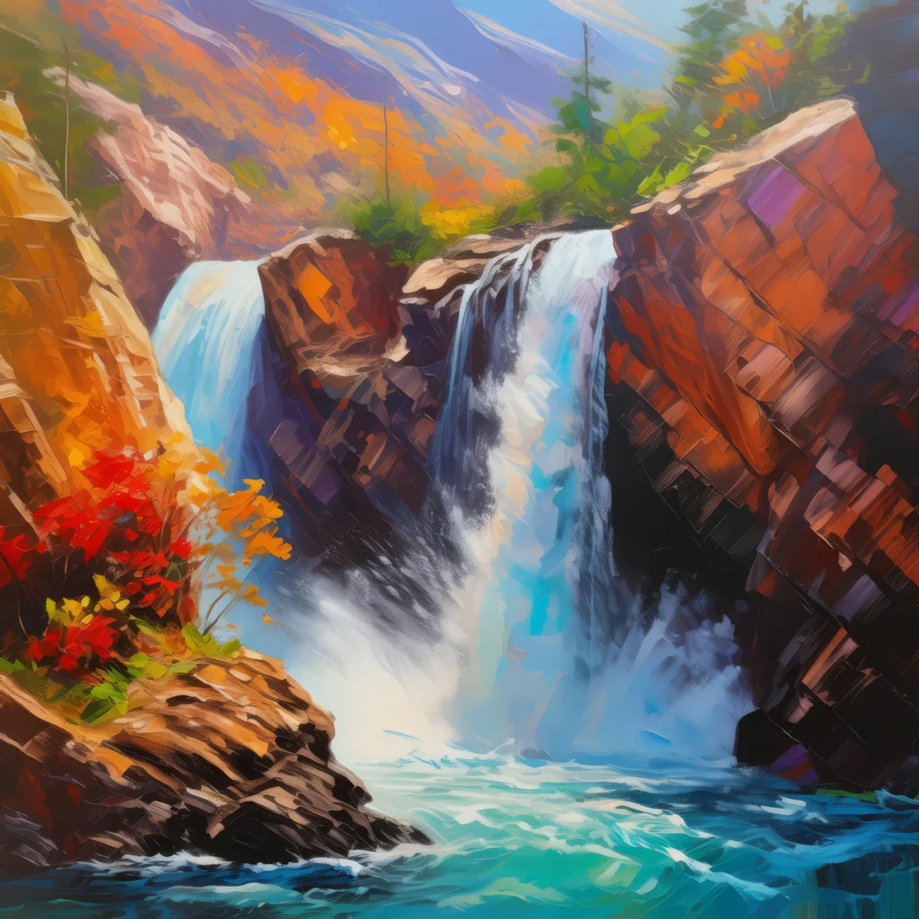 A powerful waterfall carves through a narrow rocky gorge, creating a misty spray.