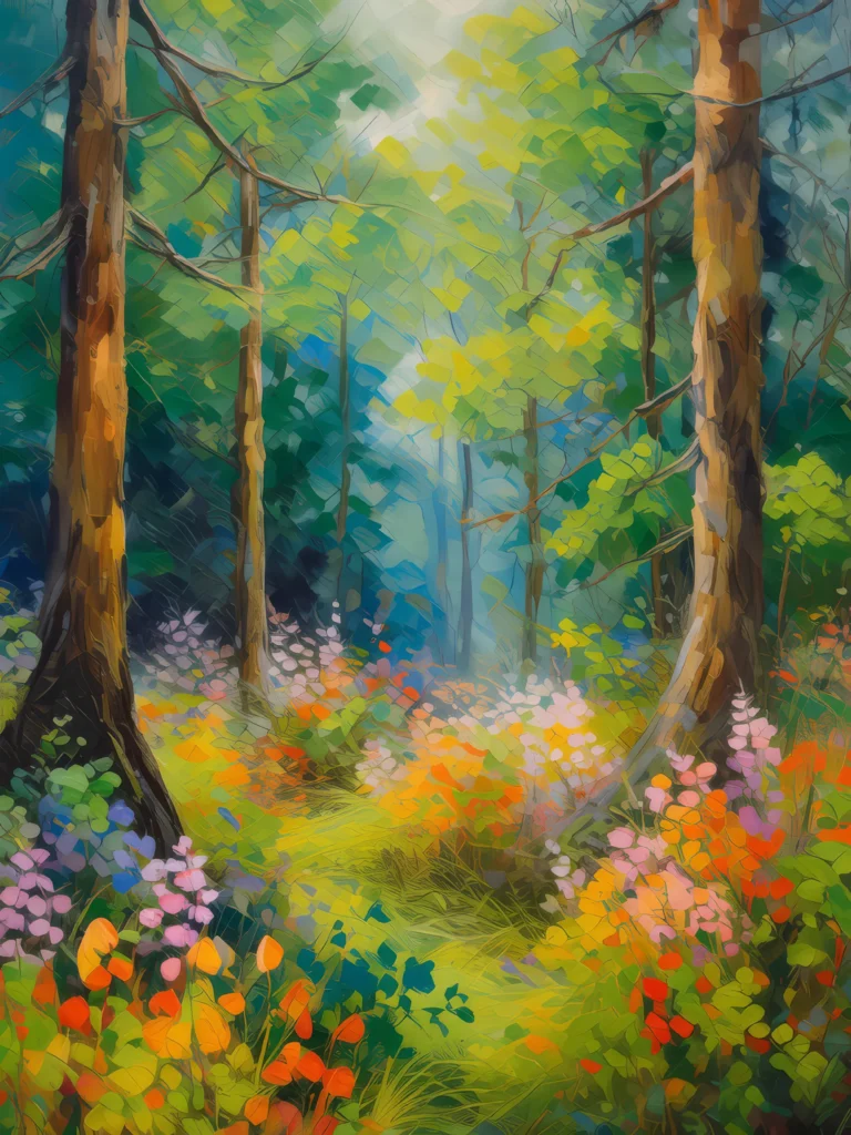 The flowering undergrowth of a temperate forest teases with bursts of color and life amid the trees.