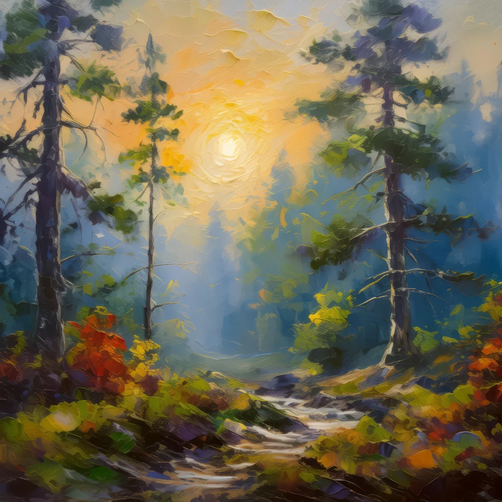 Early morning fog blankets a temperate forest, with the first rays of sun piercing through.