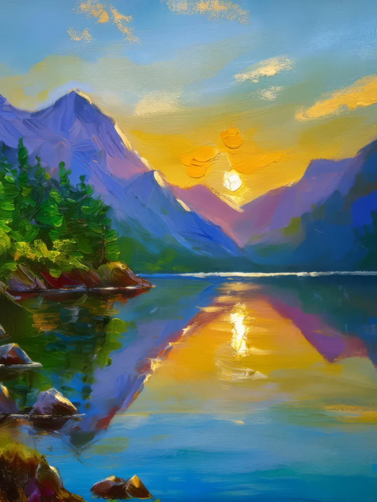 A tranquil sunrise over an alpine lake, reflecting the surrounding mountains and clear sky.