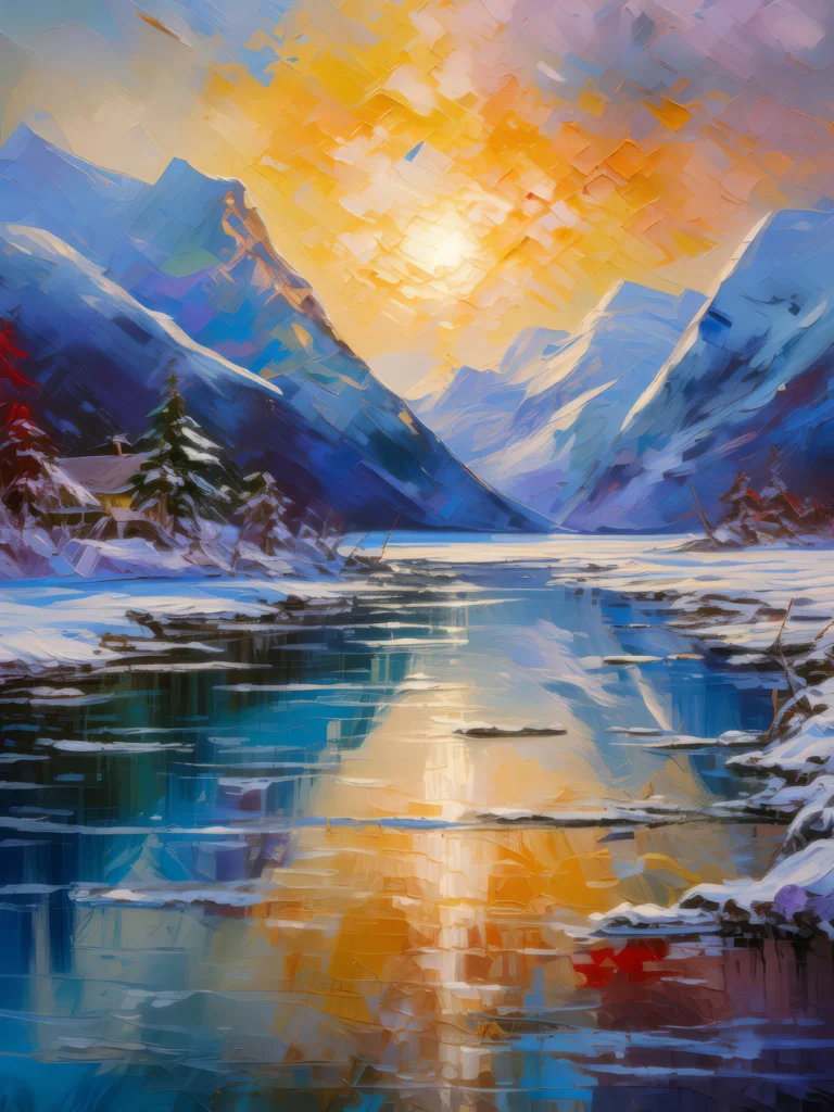 The fjord’s frozen surface sparkles under the winter sun, surrounded by ice-clad mountains and silent air.