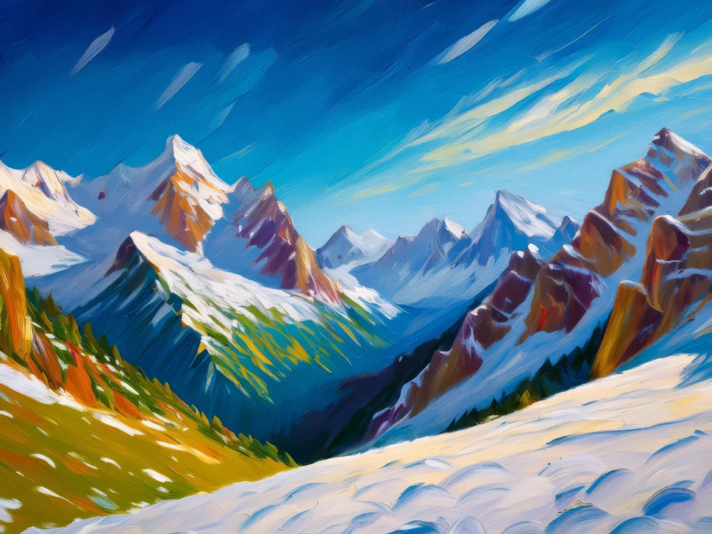 A panoramic view of alpine mountains covered in deep snow under a clear blue sky.