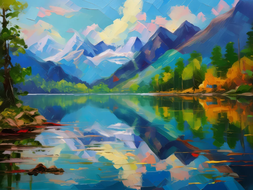 A serene alpine lake mirrors the sky and mountain scenery around it.
