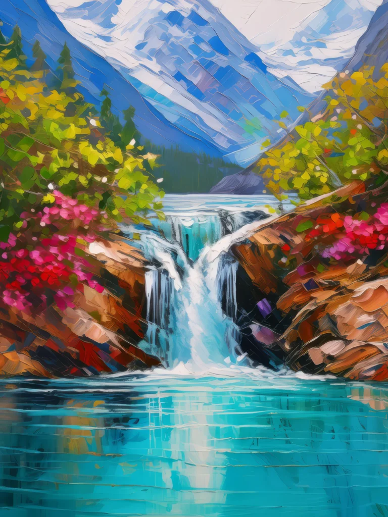 A pristine waterfall flowing from the edge of a melting glacier into a clear lake.