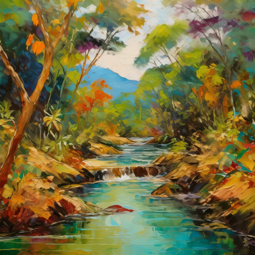 A gentle stream winding through the tropical dry forest, surrounded by lush vegetation.