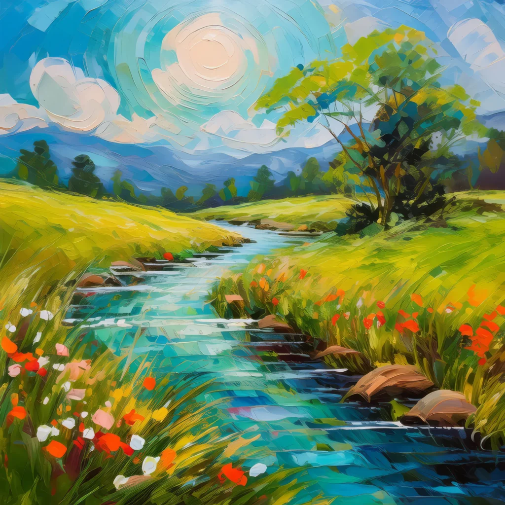 A glistening stream winding through a lush grassland under the midday sun.