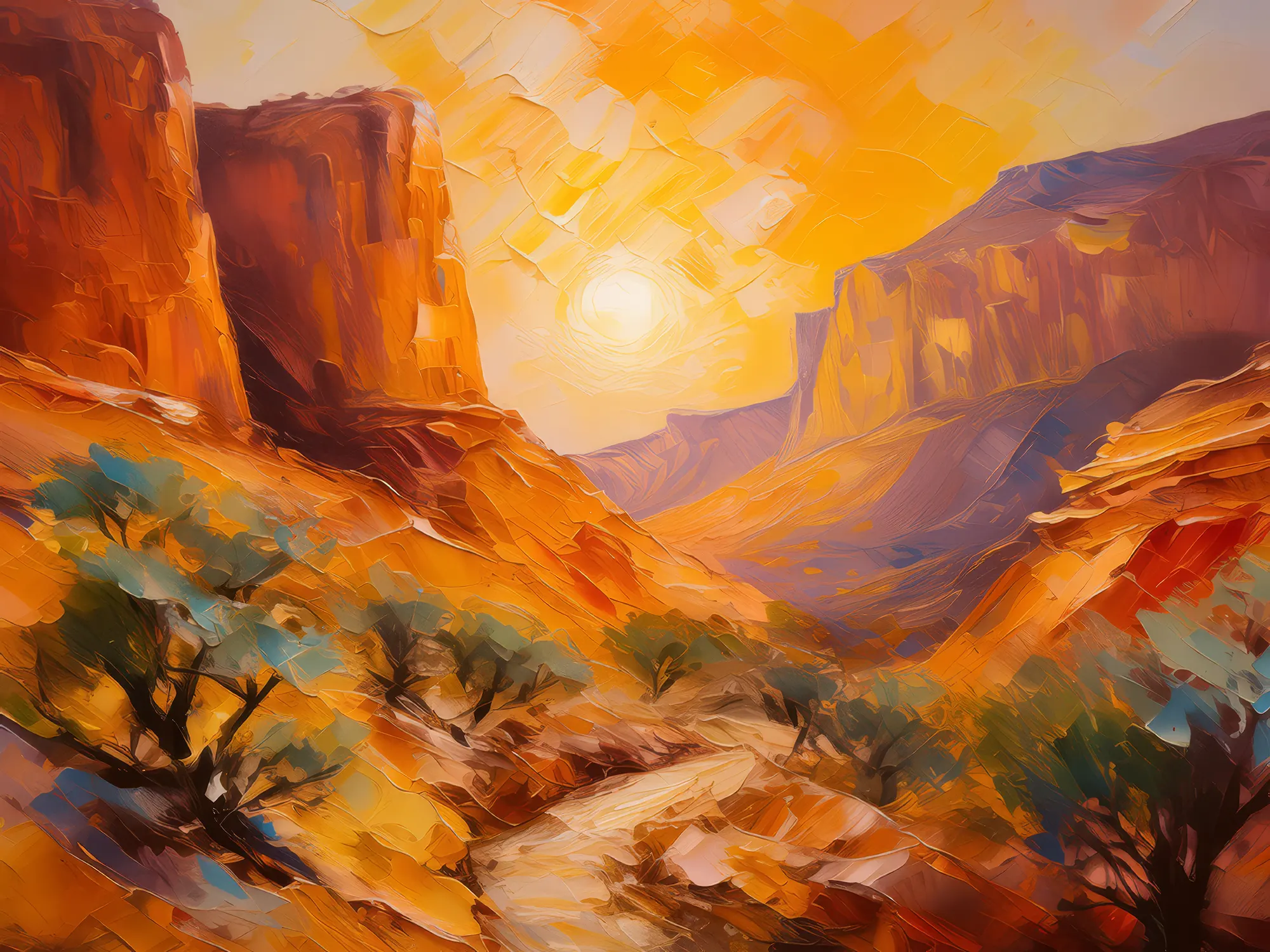 Sunrise illuminating a desert canyon, with steep walls glowing orange and shadows playing across the rugged landscape