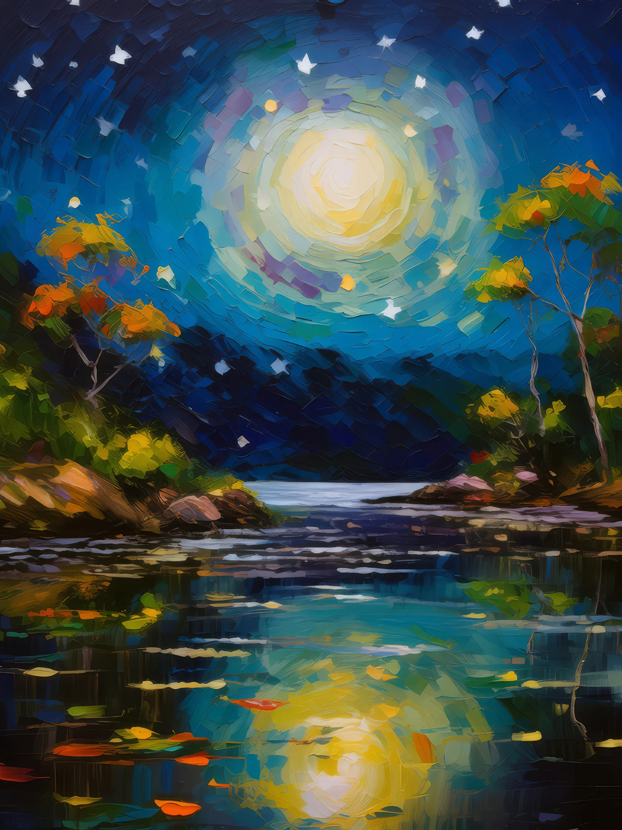 Moonlit Lagoon TranquilityBy Emma Mickelberg / July 28, 2020 A peaceful lagoon under a moonlit sky, with shimmering reflections on the water. Painted in 2001. View ‘Moonlit Lagoon Tranquility’ on Society6