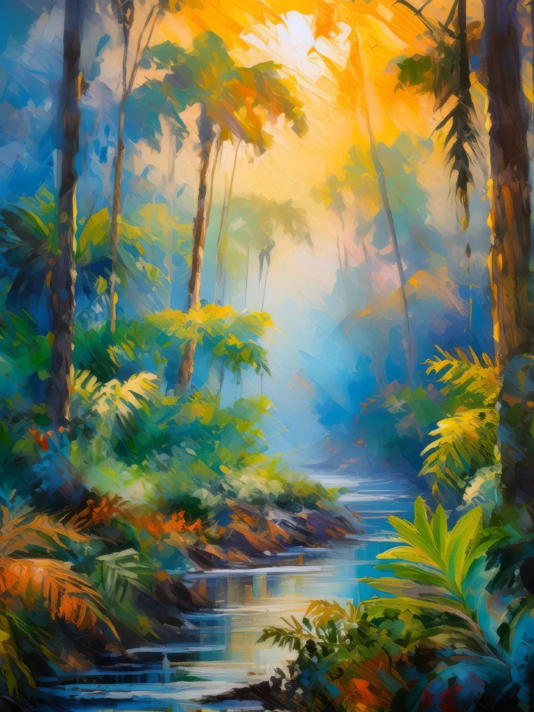 First light pierces the dense canopy of a misty tropical jungle, awakening its inhabitants.