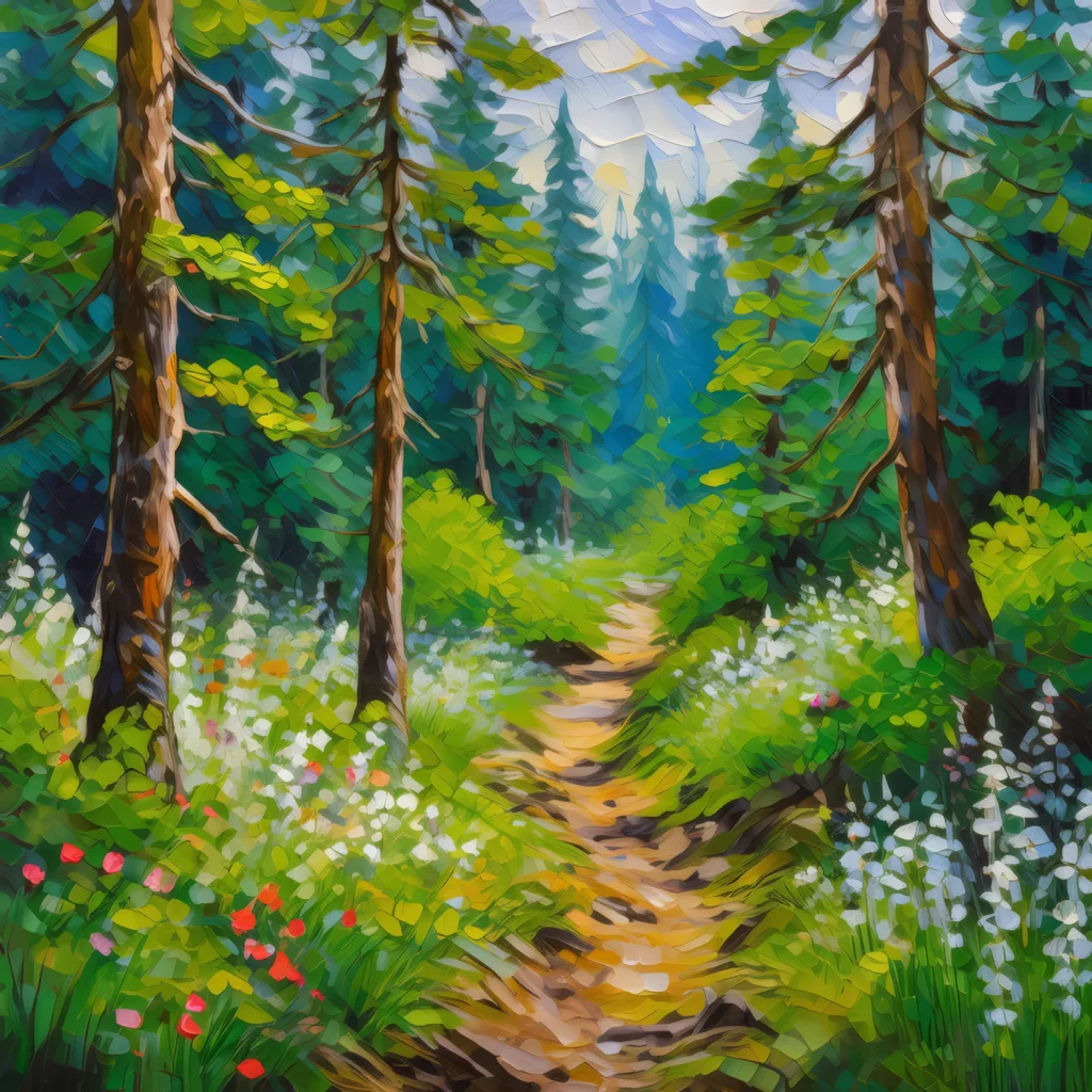 A hiking trail through a boreal forest in spring, surrounded by fresh greenery and wildflowers.