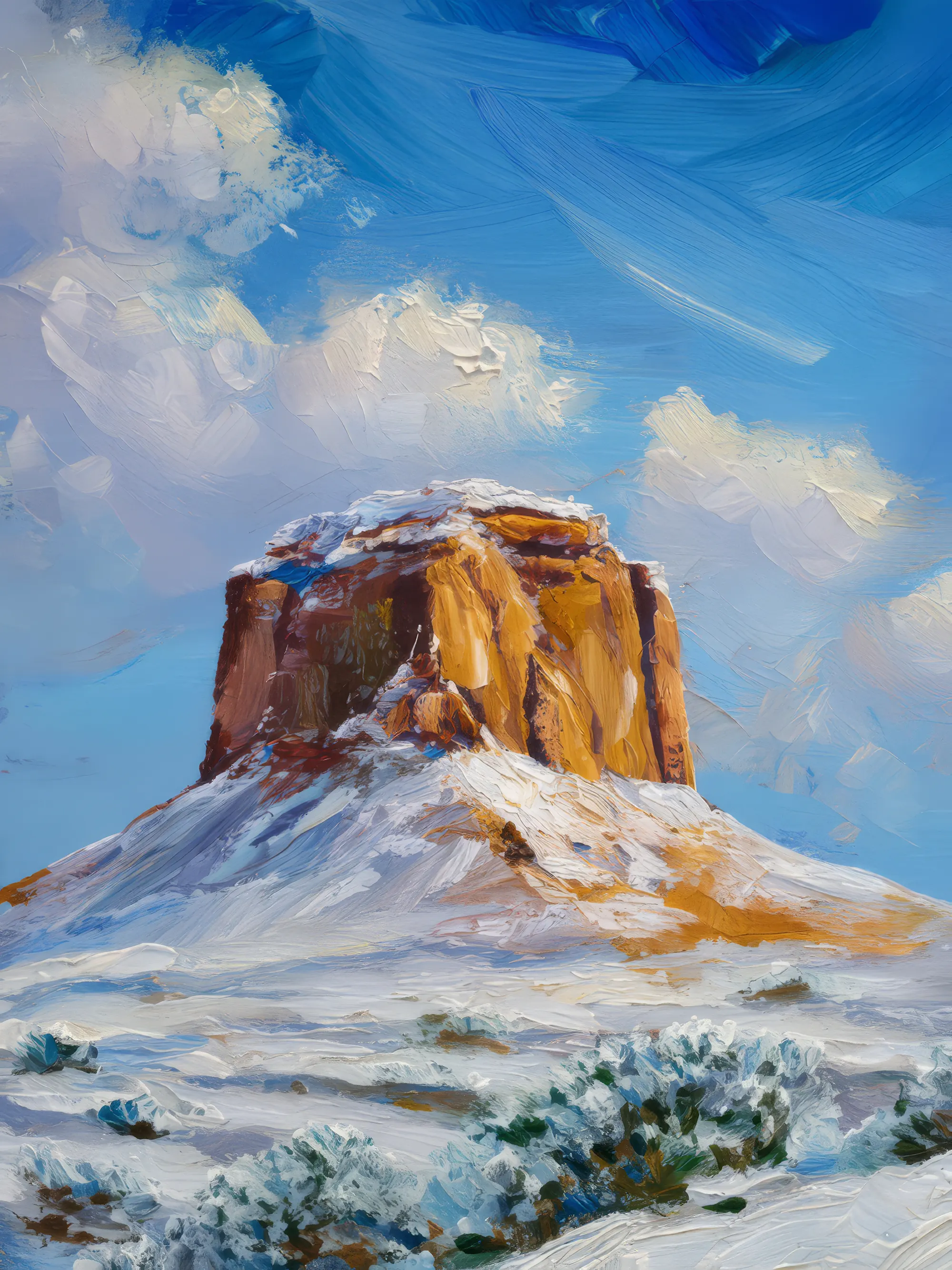 Snow-Covered Mesa PeakBy Emma Mickelberg / April 2, 2025 A mesa peak covered in fresh snow under a bright winter sky. Painted in 2011. View ‘Snow-Covered Mesa Peak’ on Society6