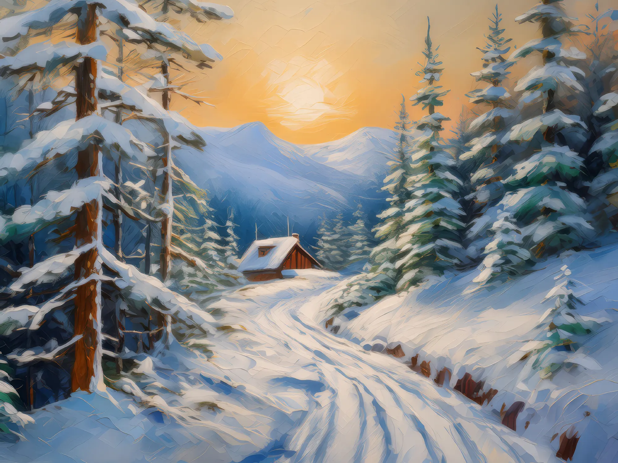 A secluded backcountry trail covered in fresh snow, with ski tracks winding through frosty pines and a distant cabin emitting a cozy glow.