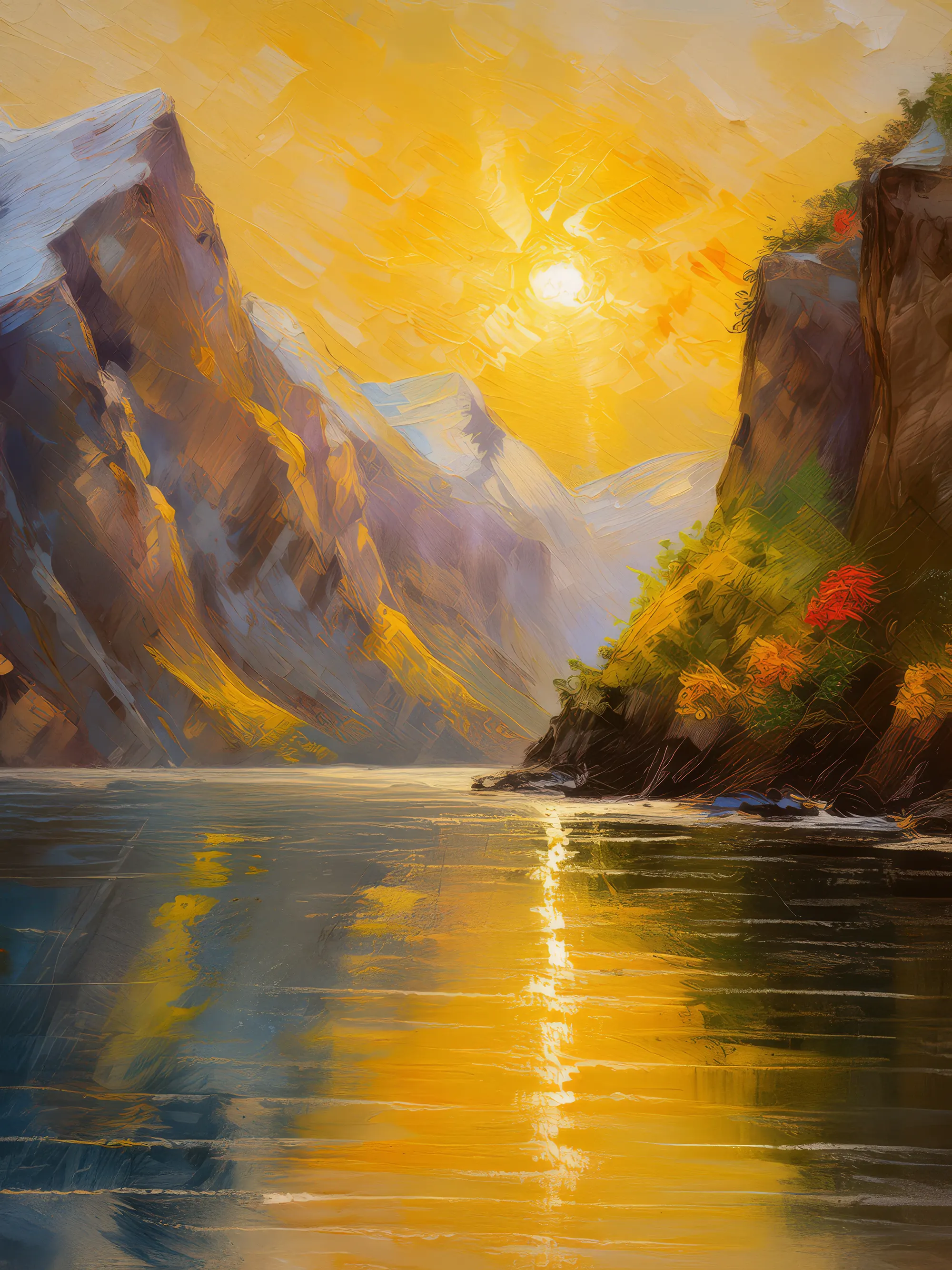 Sunset Over the FjordBy Emma Mickelberg / July 28, 2020 The sun sets over the fjord, casting a golden glow on the steep cliffs and reflective waters. Painted in 2014. View ‘Sunset Over the Fjord’ on Society6