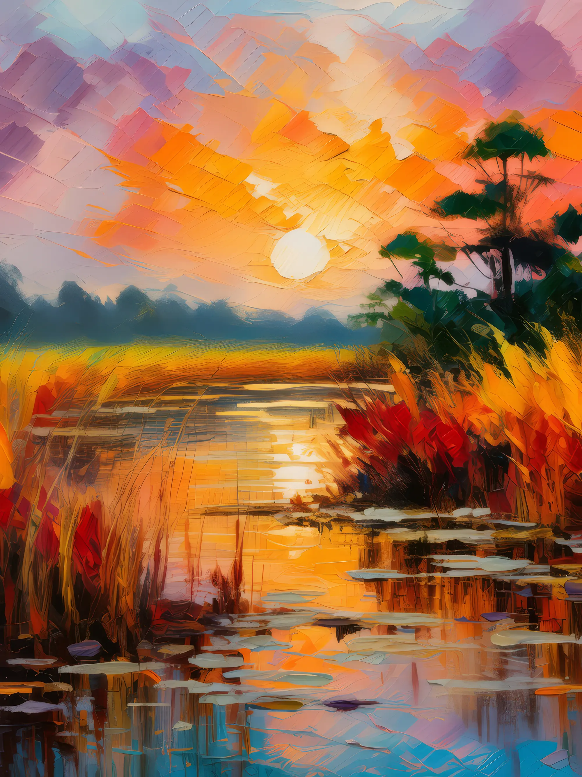 Sunset Over WetlandsBy Emma Mickelberg / September 21, 2024 A vibrant sunset over a wetland area with still water, tall grasses, and reflected colors. Painted in 2018. View ‘Sunset Over Wetlands’ on Society6