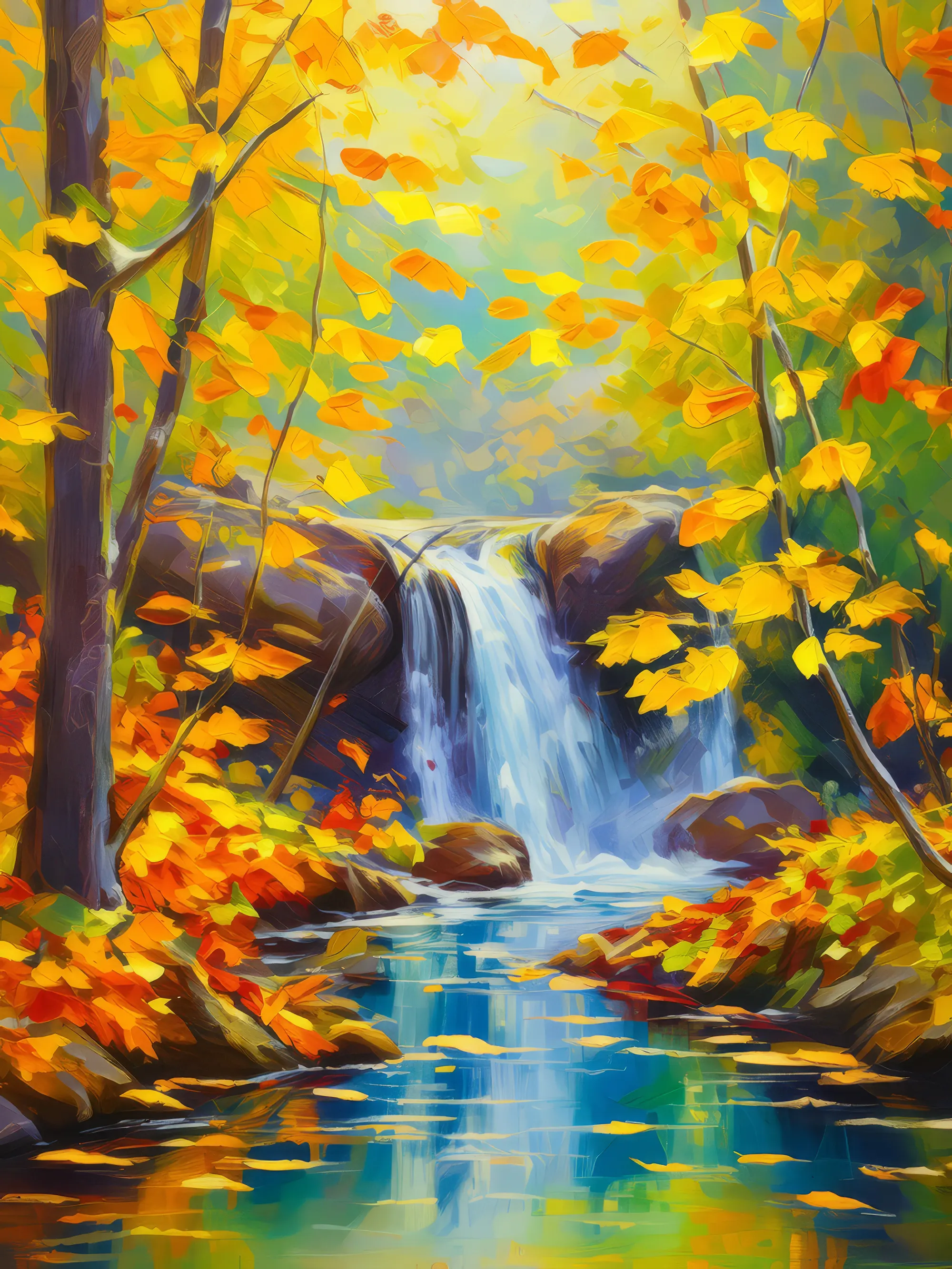 Waterfall Amidst Autumn GloryBy Emma Mickelberg / August 12, 2020 A tranquil waterfall flowing through a forest of golden autumn leaves. Painted in 2013. View ‘Waterfall Amidst Autumn Glory’ on Society6